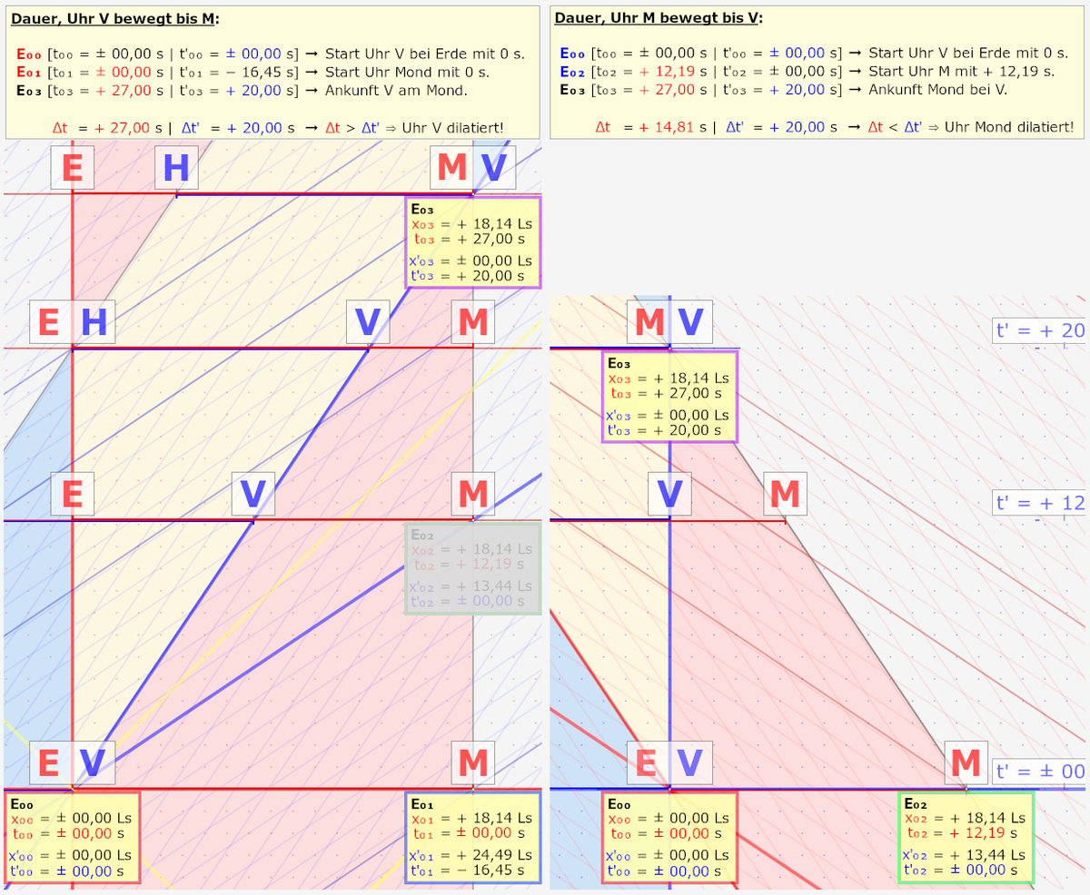 Hier passiert also nichts weiter, als dass sich die Uhr V von der Erde zu M den Mond bewegt, über 18,14 Ls in 27 s. Diese seltsamen Werte hab ich mir nicht ausgedacht, sondern die hat leider wer so ungeschickt vorgegeben.