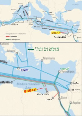 Sonntag 3. Februar - Der ägyptische Kommunikationsminister berichtet, die Trennung der Kabel vor Alexandria wurden nicht durch Schiffe und deren Anker verursacht. Video-kameras welche das Gebiet beobachten, hätten keinen Schiffverkehr in der fraglichen Zeit dort festgestellt. Ausserdem ist die Gegend als "no-go-zone" auf den Karten markiert.(KT)