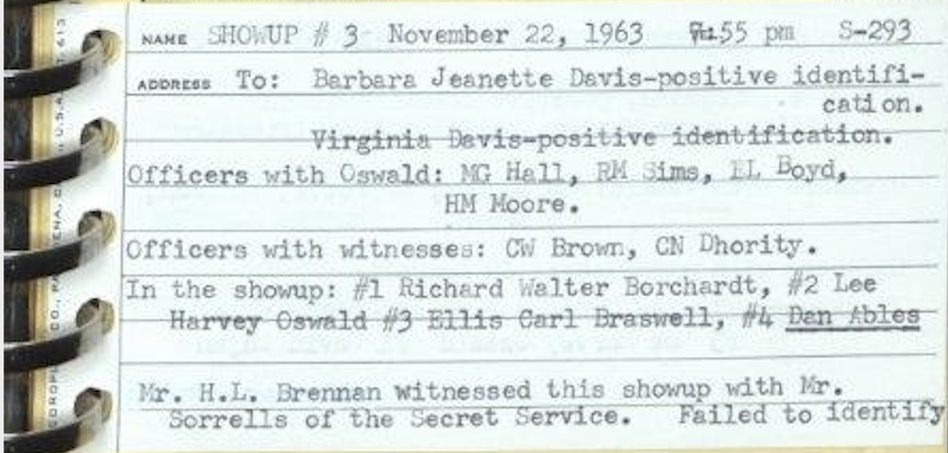 hat nur ausgesagt, dass Oswald dem Schützen von allen im fragwürdigen Line-Up am ähnlichsten wäre.Here's the note on this "show-up" that turned up decades after the fact. To be clear, this comes from a small address book used by Capt. Fritz to list the evidence in this case--that was eventually scanned and put online by the University of North Texas.