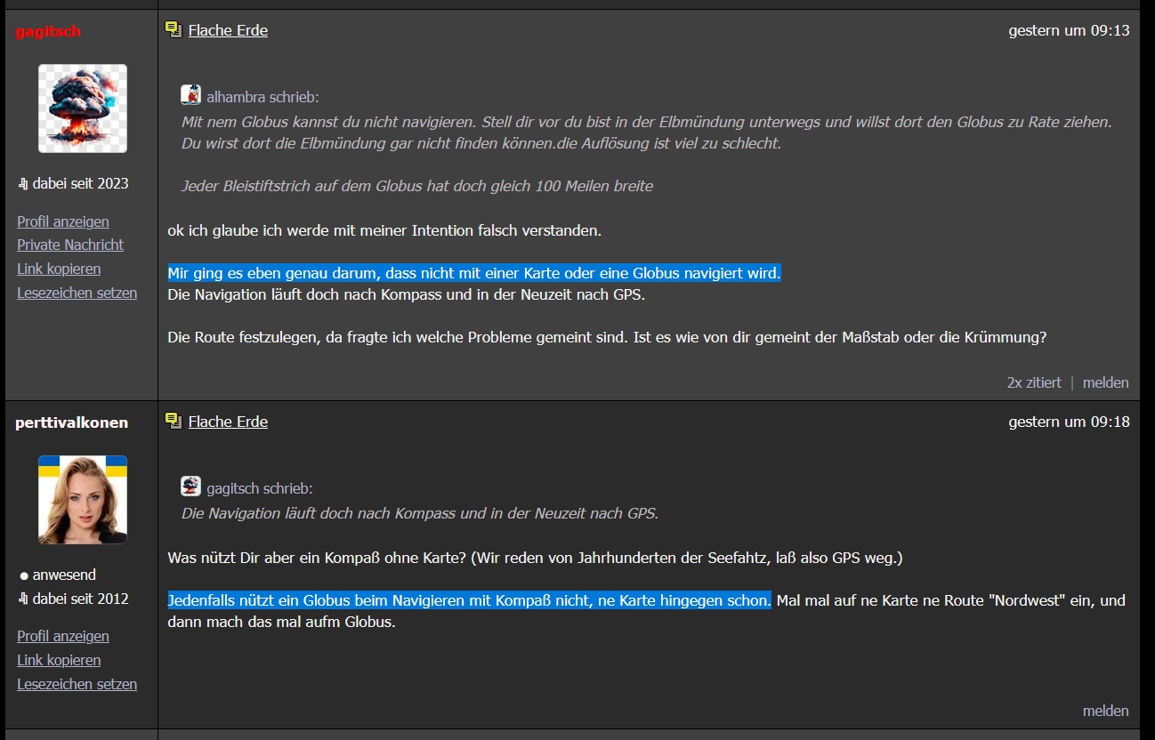 Mir ging es ja um die Aussage und meine Frage dazu welche Probleme im vergleich zwischen Karte und Globus existieren, was da gemeint war.Toxid schrieb:Ich kann dir als ehemaliger Segler und Besitzer des SBF See sagen, dass das einzige, was man braucht, eine Karte ist.