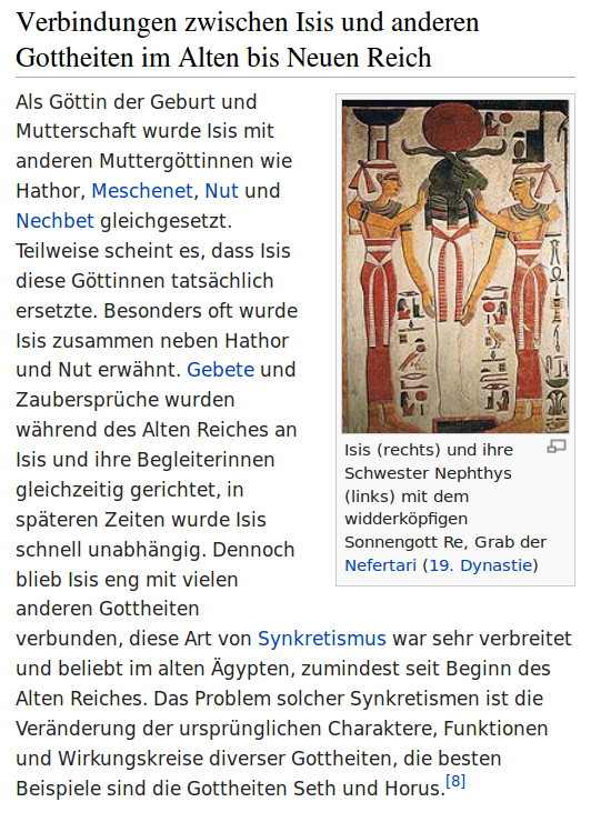 ==> ……Isis (von ägypt. Aset) ist eine Göttin der ägyptischen Mythologie. Sie war die Göttin der Geburt, der Wiedergeburt und der Magie, aber auch Totengöttin.PHK schrieb: Aber wieso "Isis/Hathor" ?
