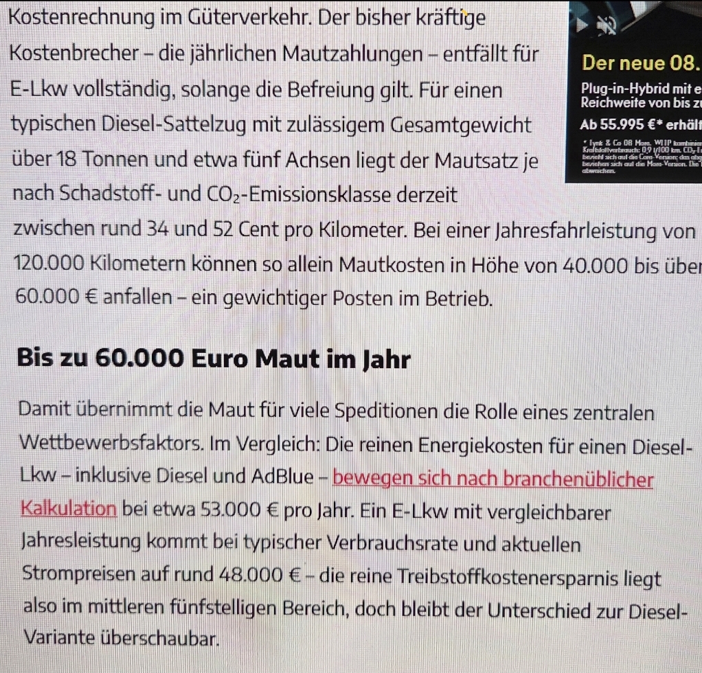 Forester schrieb:Gleichwohl ist es grundsätzlich völlig klar, dass der elektro LKW effizienter, kostengünstiger, schneller bei bergigen Strecken, angenehmer für die Fahrer zu fahren und viel wartungsärmer ist.