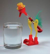 03.02.2013 um 12:26Durch das Eintauchen im Wasser wird der Schnabel befeuchtet. Dieses Wasser verdunstet und kühlt damit den Kopf des Vogels. Dadurch entsteht ein Unterdruck der die rote Flüssigkeit nach oben zieht und den Schwerpunkt verlagert. Das ganze funktioniert solange bis kein Wasser mehr im Glas ist.