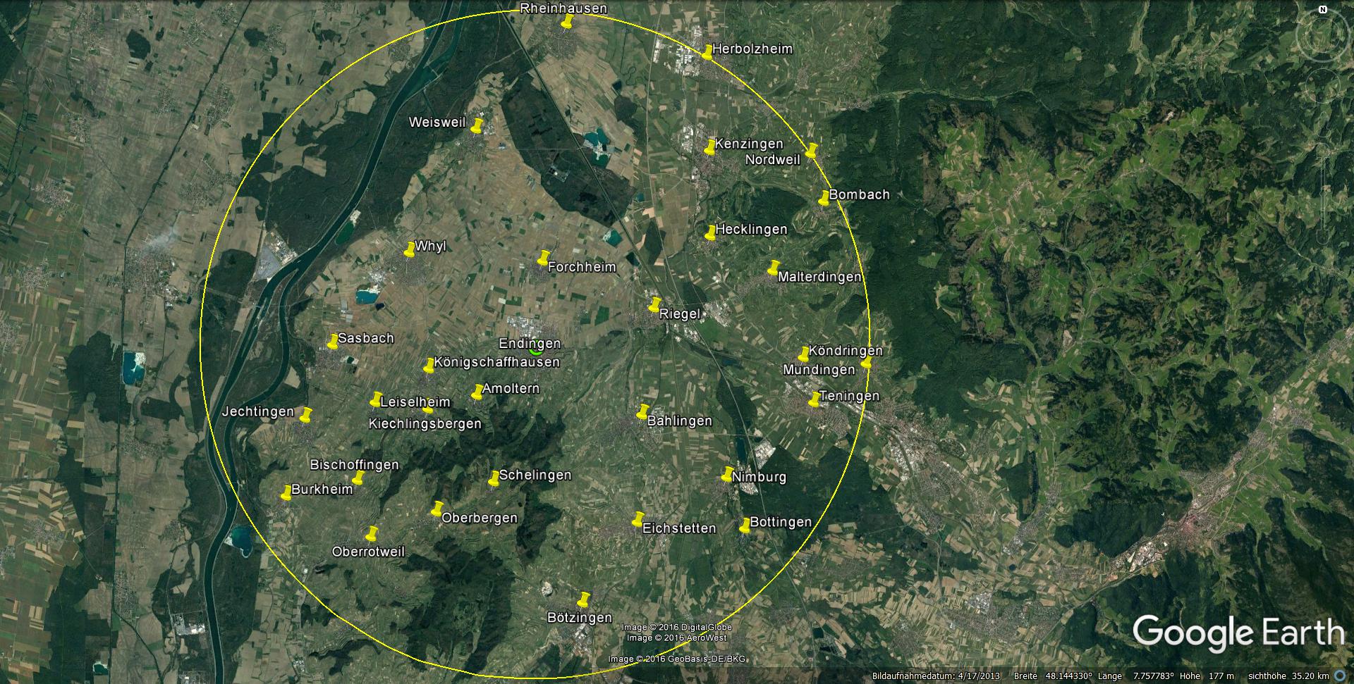Wenn man einen Umkreis von 10km (beispielhaft) um Endingen zieht, wären ungefähr 82896 Einwohner bei 36 Ortschaften