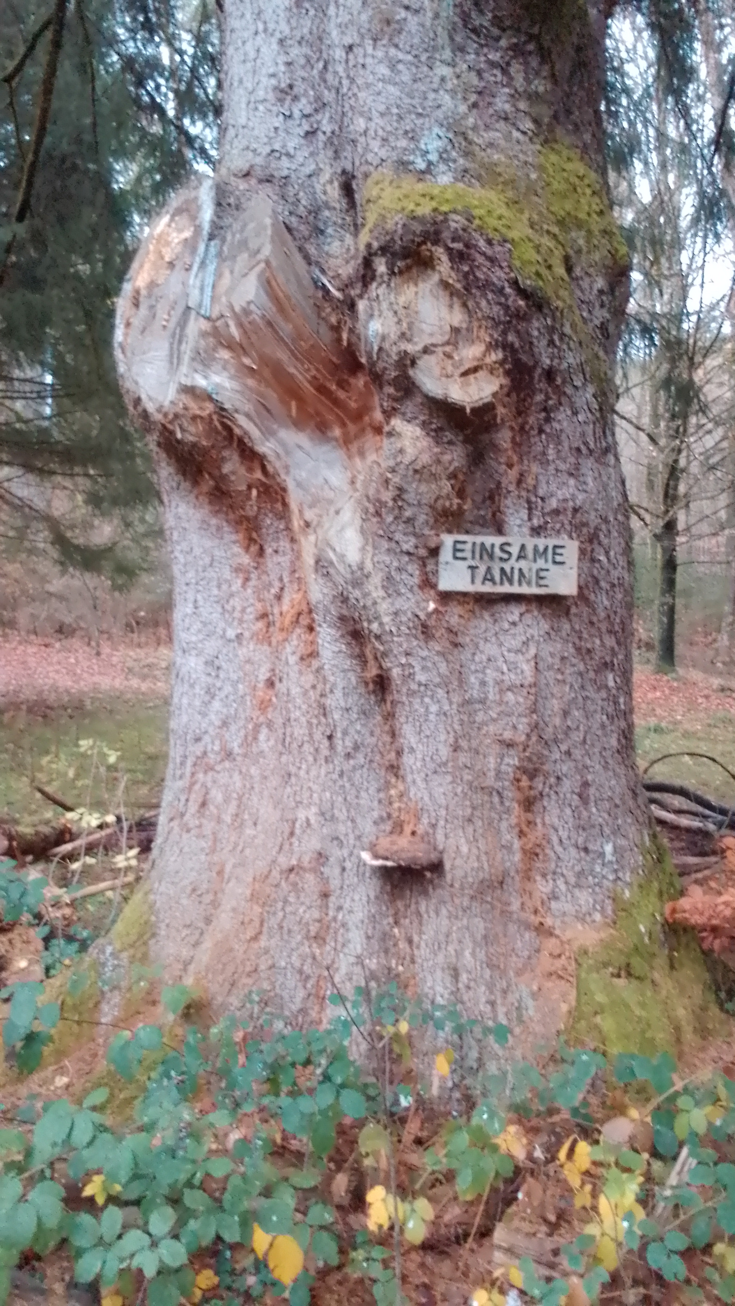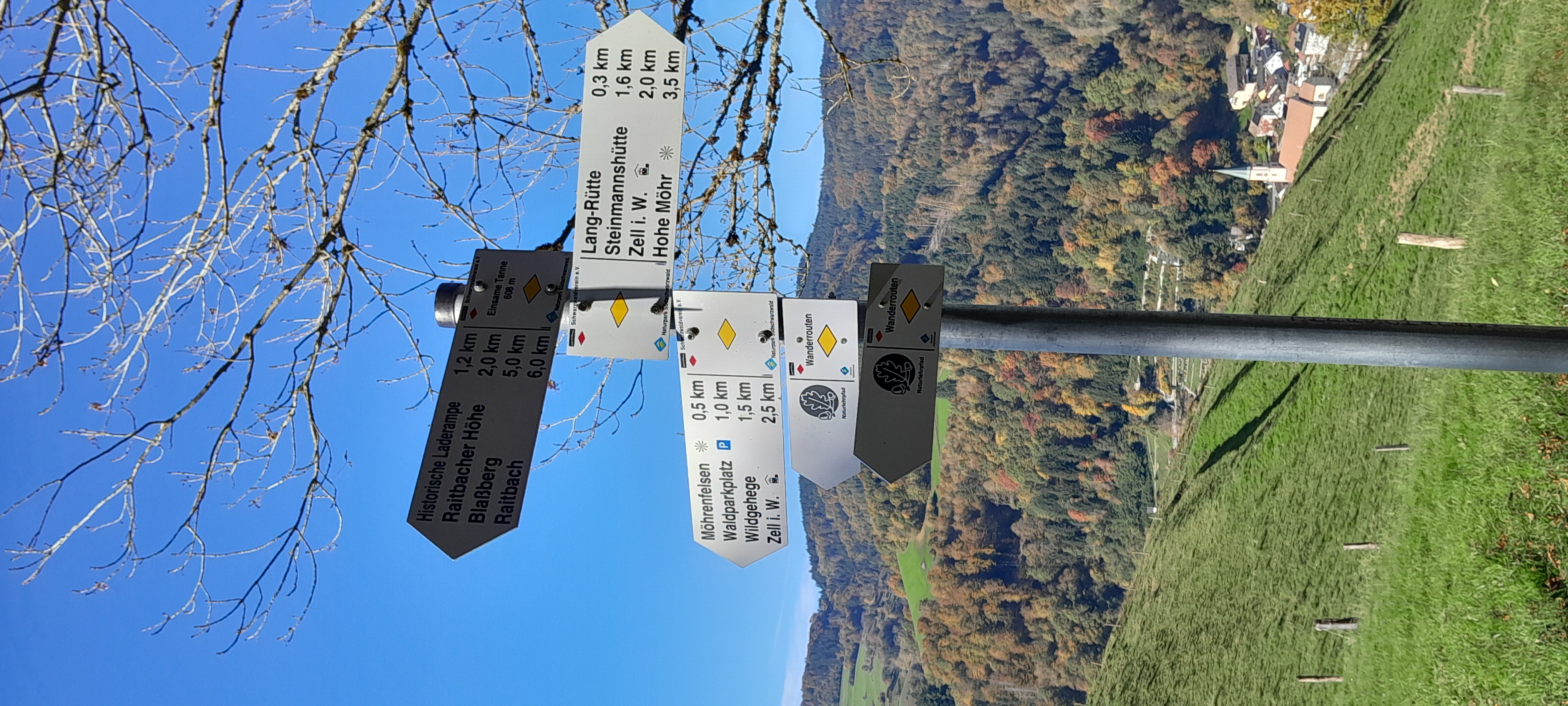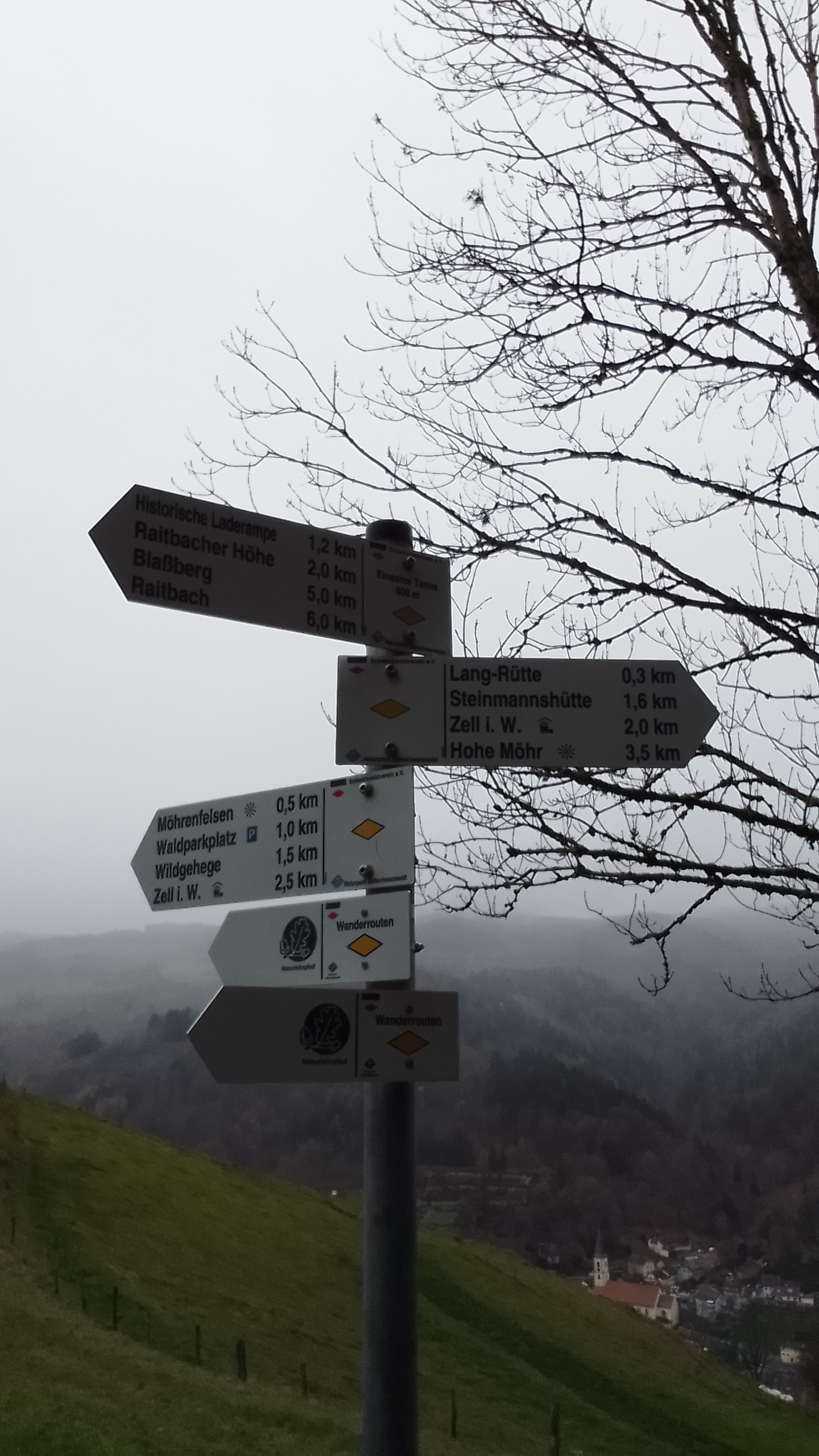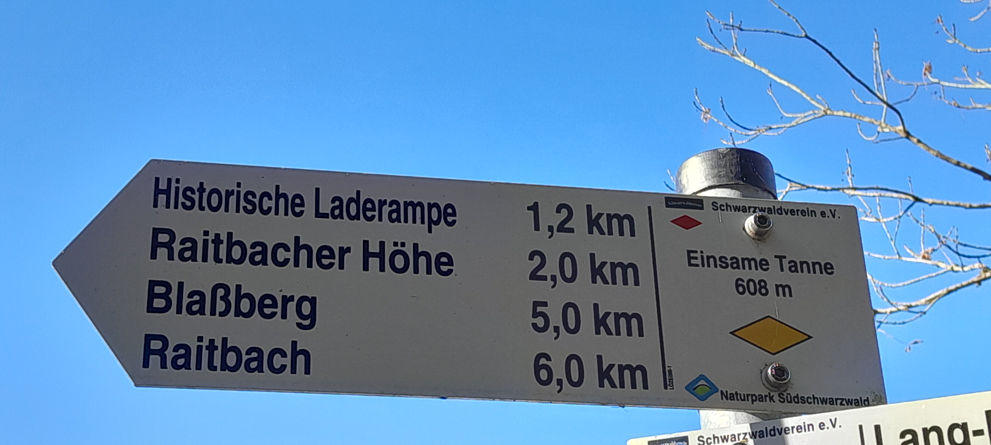 Original anzeigen (2,3 MB)(Bild: Wegzeiger an der Einsamen Tanne mit dem einzig markierten Weiterweg nach Raitbach. Ansonsten ginge es nur zurück oder nach Zell.)