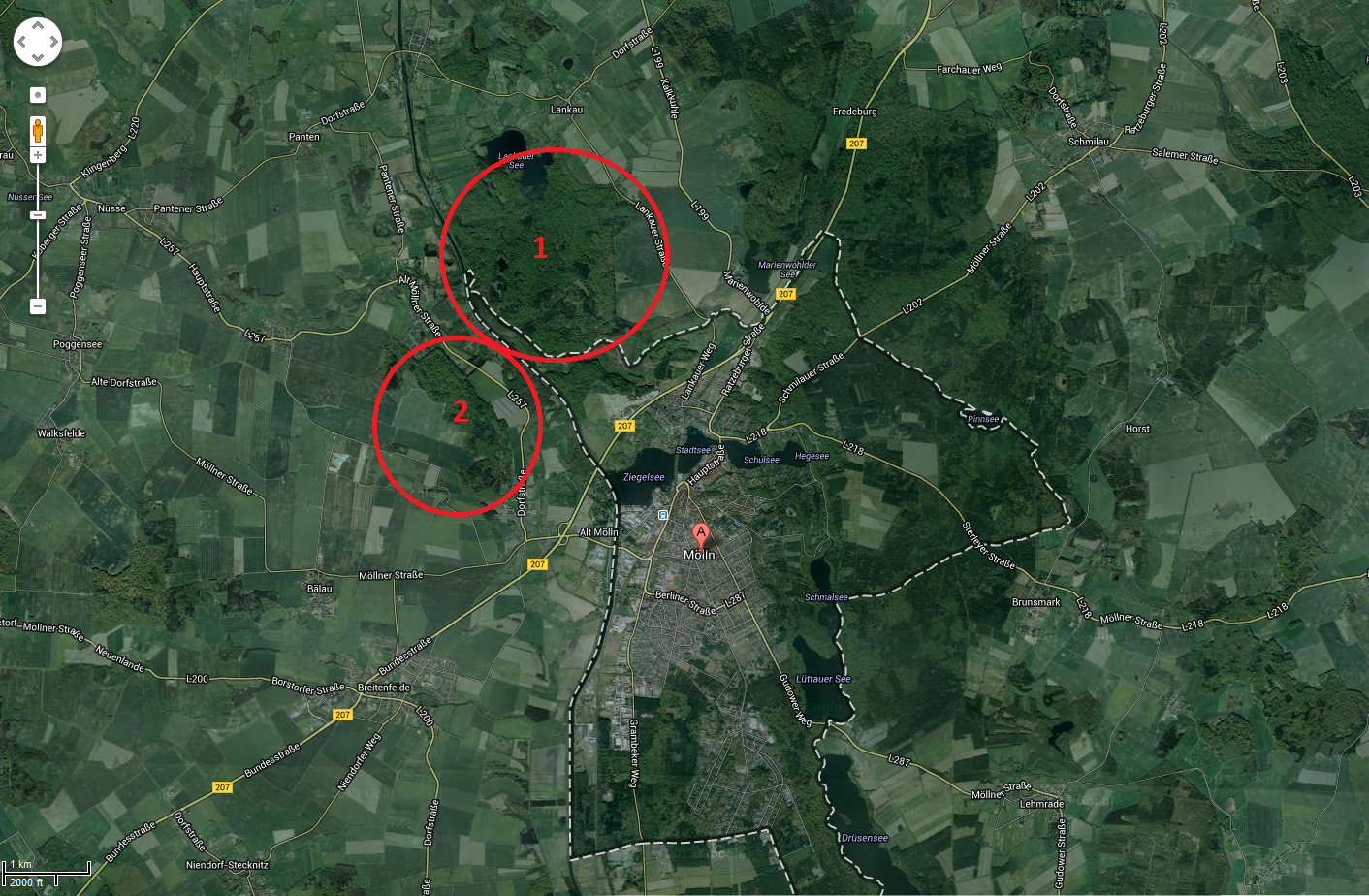 Beim genaueren betrachten deiner Zeichnung ist mir eine Unstimmigkeit aufgefallen, diese ist folgende. Der von dir erwähnte "rot gezeichnete Waldweg" ist in Wirklichkeit, zumindest laut Google Earth, kein Waldweg sondern ein schlichtes Feld. Zur persönlichen Überprüfung habe ich einen Vergleich beigefügt. Ich möchte deshalb aufs schärfst um Genauigkeit bitten, da wir, zumindest ist dies mein Ziel, doch versuchen möchten anderen Interessierten möglichst korrekte Informationen über den besagten Wald zu liefern.