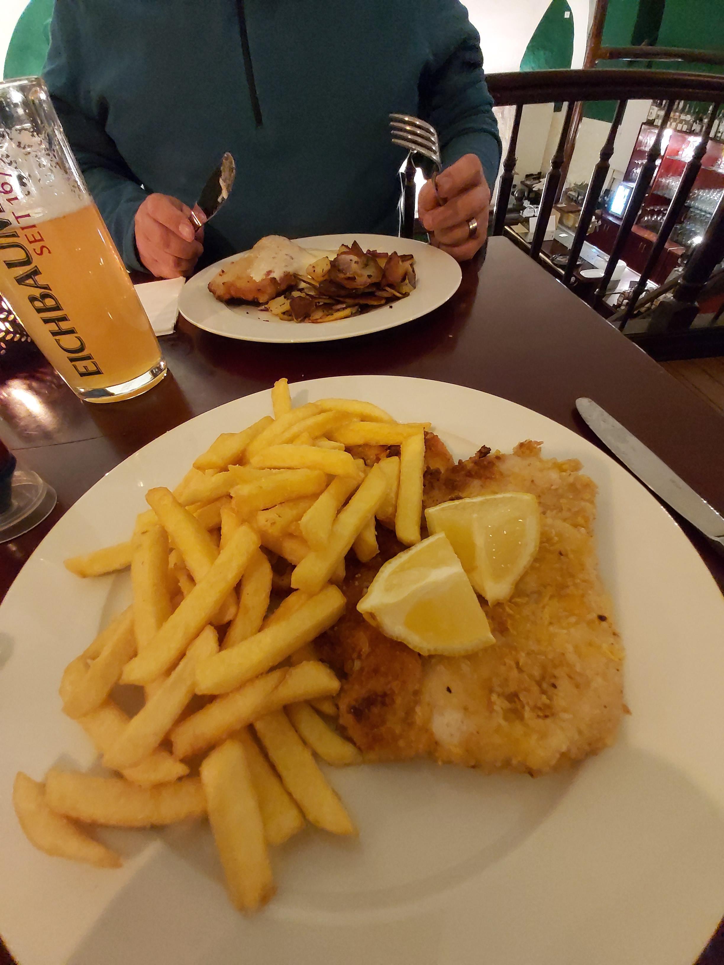 Das hatten wir gestern (keine Lust zum Kochen). Haben im Ort ein sehr uriges Lokal entdeckt. Das Gebäude aus dem 12. Jahrhundert, eine ehemalige Wasserburg. Erst haben wir noch eine Stunde draußen gesessen (mit Decke über den Knien) und die interessanten alten landwirtschaftlichen Gerätschaften beglückt (der Opa meines Freundes hatte auch zwei Arbeitspferde, mit denen er Land bestellt hat), um 17 Uhr war die Küche auf und wir gingen rein. Waren lange die einzigen Gäste. Viele gehen ja später essen.