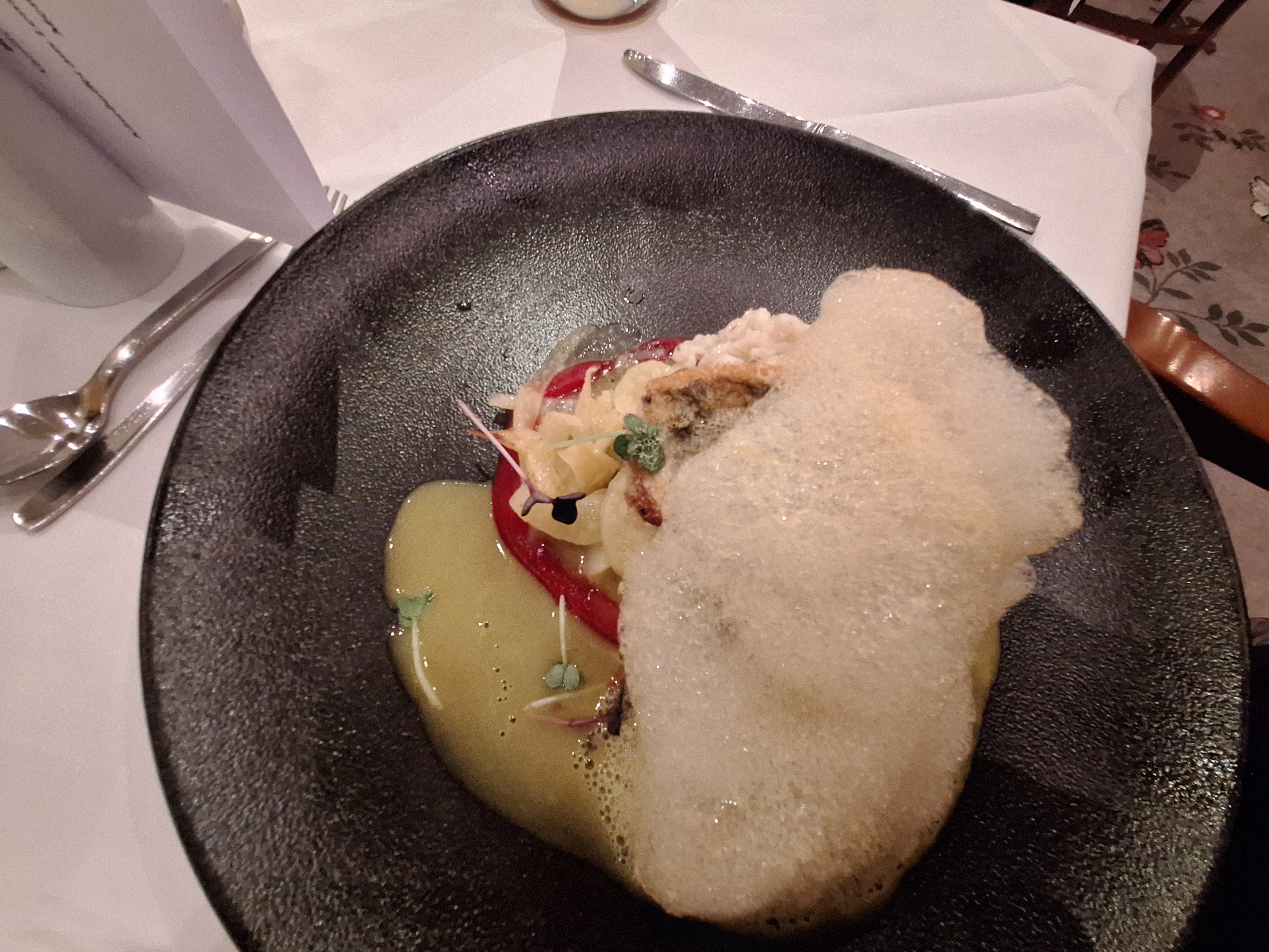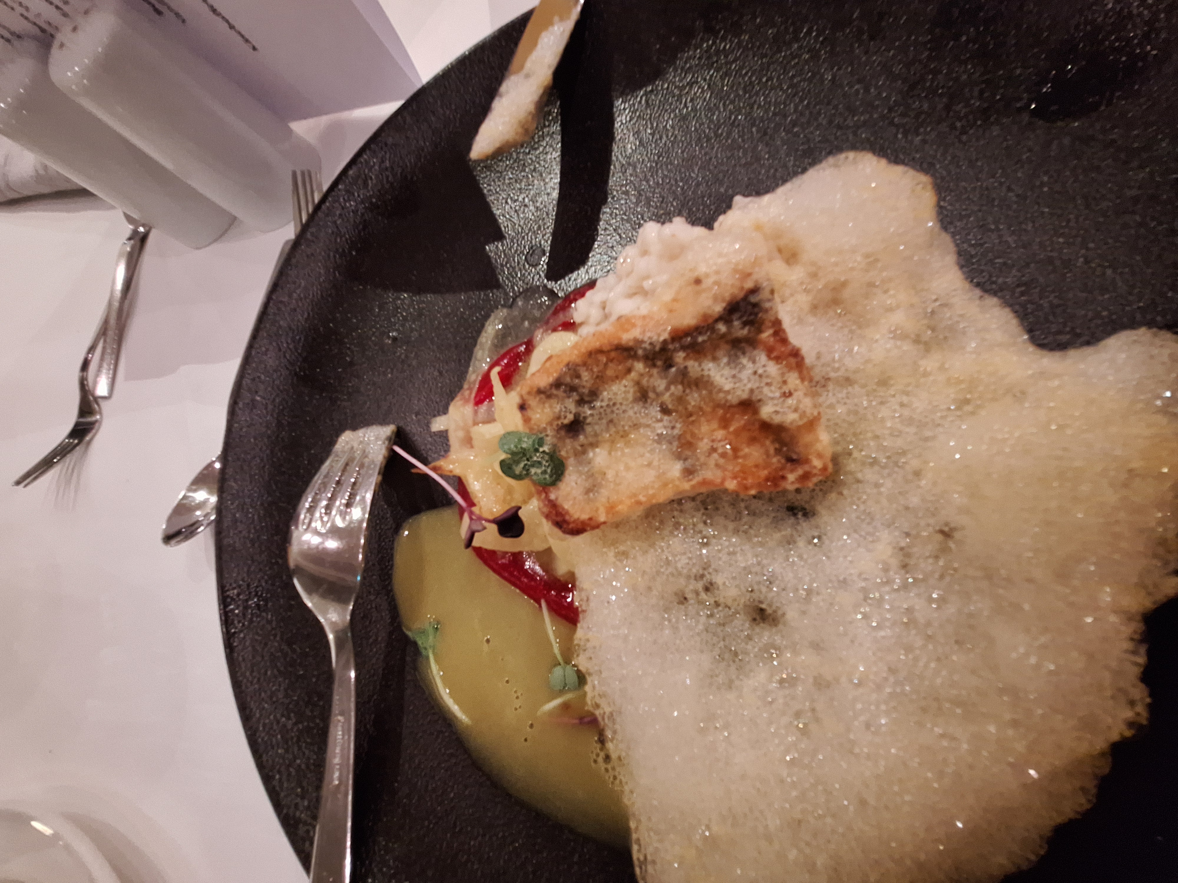 Original anzeigen (2,8 MB)Gestern Abend waren wir im Restaurant und haben von der Karte bestellt. Mein Mann bestellte ein Rumpsteak zu 38 Euro. Es gibt auch ein 5-Gänge-Menü zu 60 Euro und davon konnte man die Gänge auch einzeln bestellen. Ich habe dann Zander bestellt mit Gemüse und Perlgraupen (26 Euro) und habe den Kellner vorher extra gefragt, ob das ein Hauptgericht sei, von dem man auch satt wird. Der Kellner hat das bejaht. Aber natürlich war das nicht der Fall und wenn ich nicht noch von Herrn Nairobis Pommes gegessen hätte, wäre ich nicht satt geworden. Als der Kellner kam und fragte, wie es war, habe ich gesagt, dass es geschmacklich sehr gut gewesen sei, aber entgegen seiner Aussage nicht einem Hauptgericht entspräche usw. Der Kellner hat mir nach kurzer Diskussion daraufhin noch eine Portion gebracht. Ich habe das mal fotografiert, das Stückchen Fisch (ca. 5cmx2,5 bis 3 cm ist unter dem Orangenschaum versteckt)
