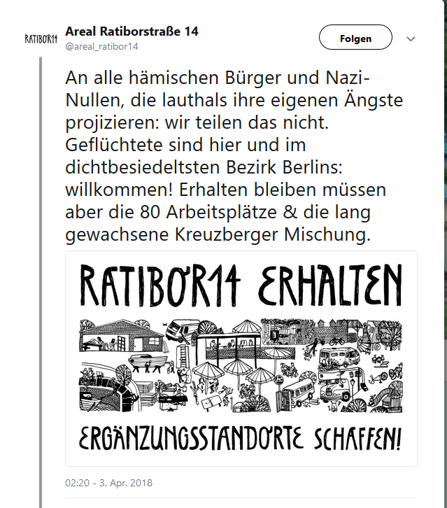 Ich finde, das klingt sehr doppelmoralisch. Denn angeblich geht es doch um zu Tode verängstigte, traumatisierte etc. Menschen. Wie kann man die dann ablehnen mit der Begründung, man fühle sich durch deren Anwesenheit vertrieben und seiner Heimat (gewachsene Kreuzberger Mischung) beraubt?