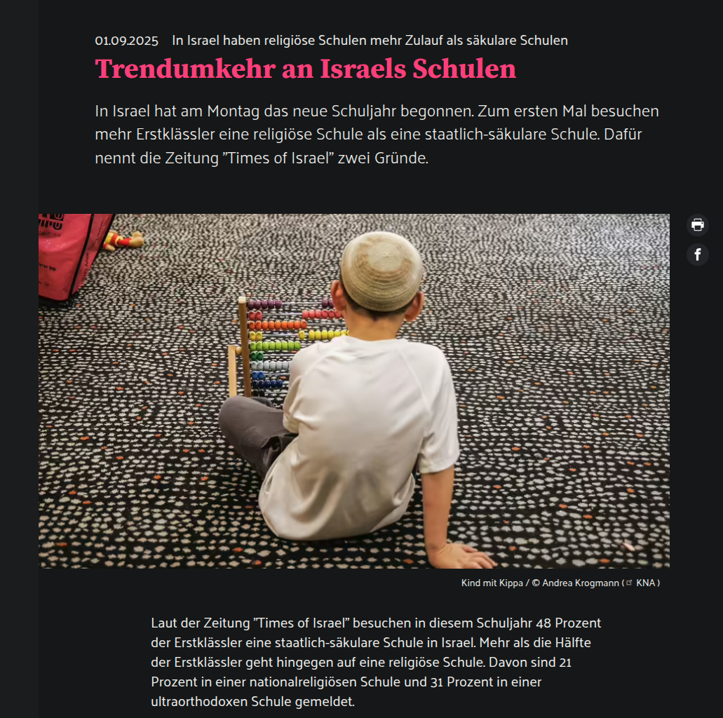 Original anzeigen (1,1 MB)Konkret dürfte aber auch die starke Auswanderungswelle der vergangenen zwei Jahre aus Israel dazu beigetragen haben, an der liberale Israelis stärker Anteil hatten als Ultraorthodoxe.Quelle: https://www.domradio.de/artikel/israel-haben-religioese-schulen-mehr-zulauf-als-saekulare-schulen