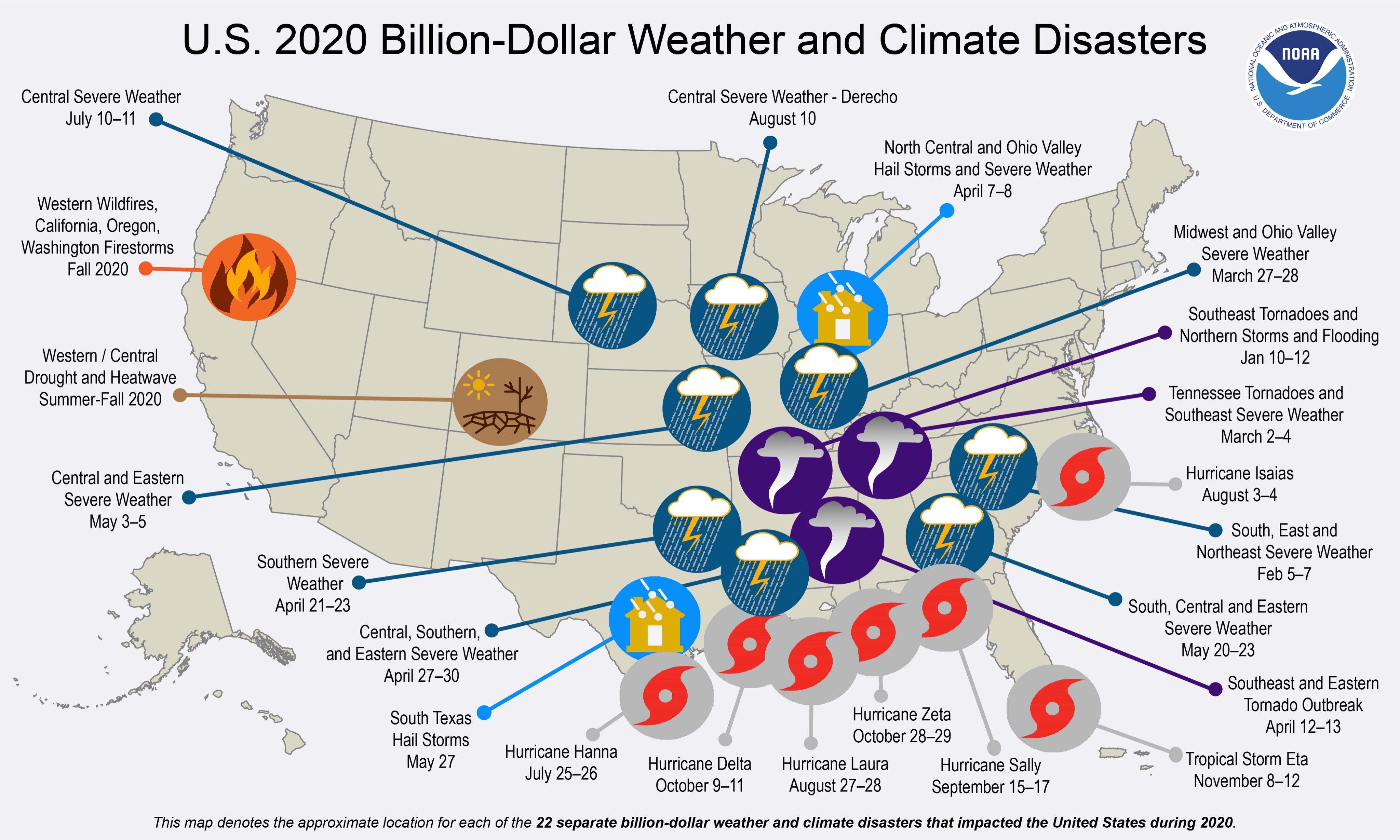 Auch in den USA sind die Schäden riesig, hier eine Karte mit allen Naturkatastrophen, die allein in 2020 über eine Milliarde Dollar Schaden angerichtet haben:
