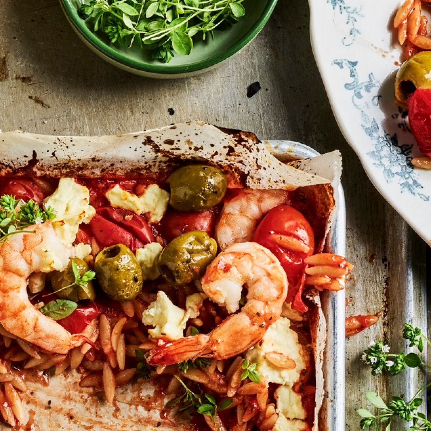 1. Risoni, Gemüsebrühe, eingelegte Kirschtomaten und Tomatenpüree in einer großen Schüssel vermengen. Knoblauchzehen schälen, hacken und untermischen. Oregano, schwarzen Pfeffer und Chili hinzufügen. Die Mischung auf ein mit Backpapier ausgelegtes Backblech geben.
