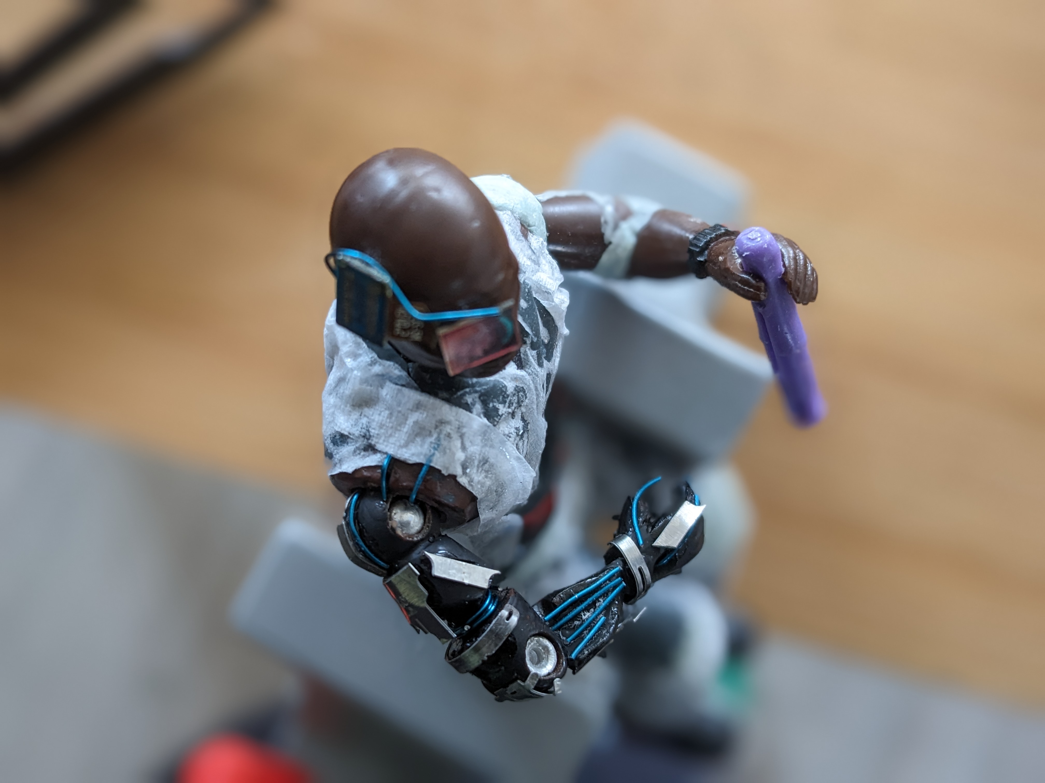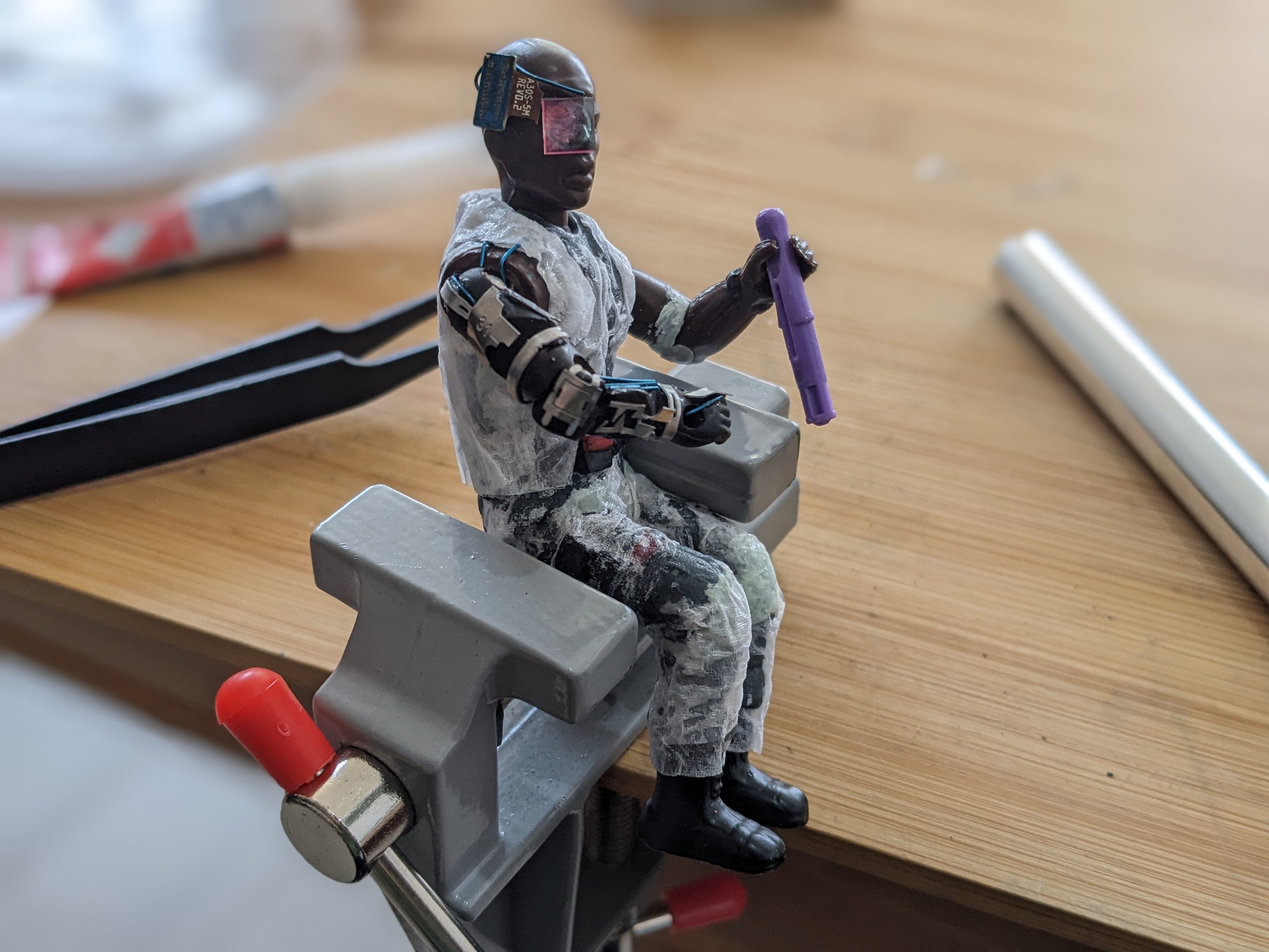 "Der Hacker" ist eine modifizierte Actionfigur die ursprünglich einen Soldaten darstellte. Waffen, Bandanna-Tuch um den Kopf, sowie Teile des rechten Arms (dieser soll später eine Armprothese/ Cyber-Arm darstellen, somit dünner gemacht damit der Arm mit zusätzlichem Material nicht zu dick wird) hatte ich bereits vor einiger Zeit weggeschnitten.