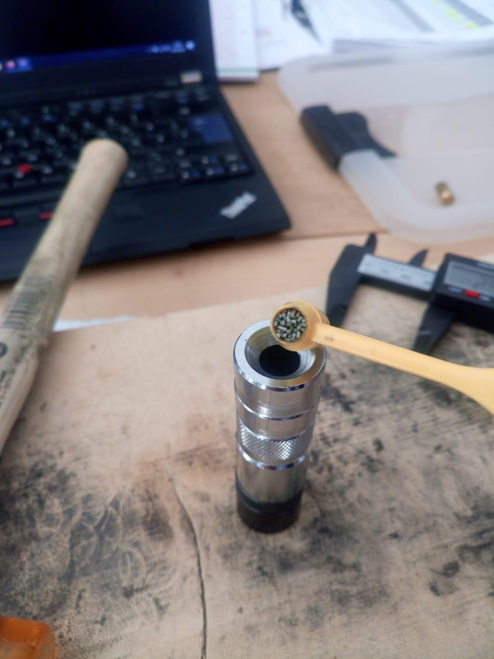 Im Grunde wird die Hülse jetzt so gelagert das man von oben drauf hämmern kann ohne das der Zünder zündet. Dann kommt auch schon das Pulver in die Patrone in meinem Fall sind es bei 9x19 Patronen ca 4,9grain vom Vihtavuori N340 (übrigens das einzige in der ganzen Beschreibung für das man wirklich eine Genehmigung braucht, abgesehen von der fertige Patrone natürlich)