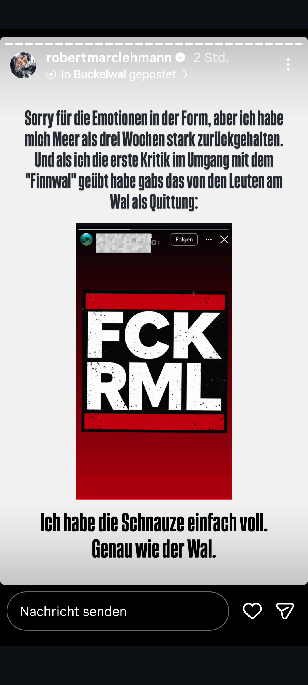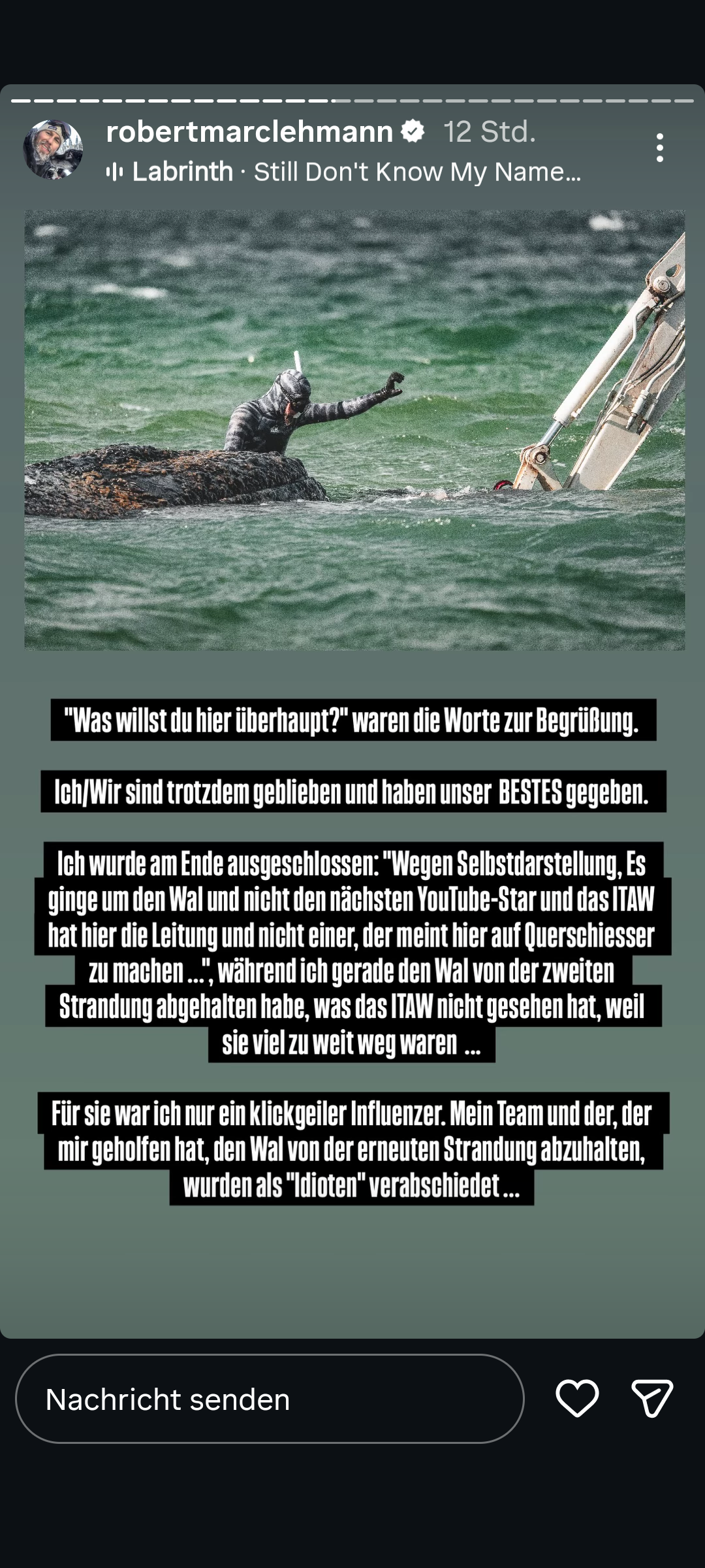 Egospielchen. Die Leute vom ITAW halten ihn für einen gewöhnlichen Influencer, der das nur zur Selbstdarstellung macht. Auf Instagram erklärt er die Hintergründe znd warum diese Einschätzung völlig falsch ist. Es ist ein Trauerspiel. Und der einzige, der drunter leidet, ist der arme Wal! 😢