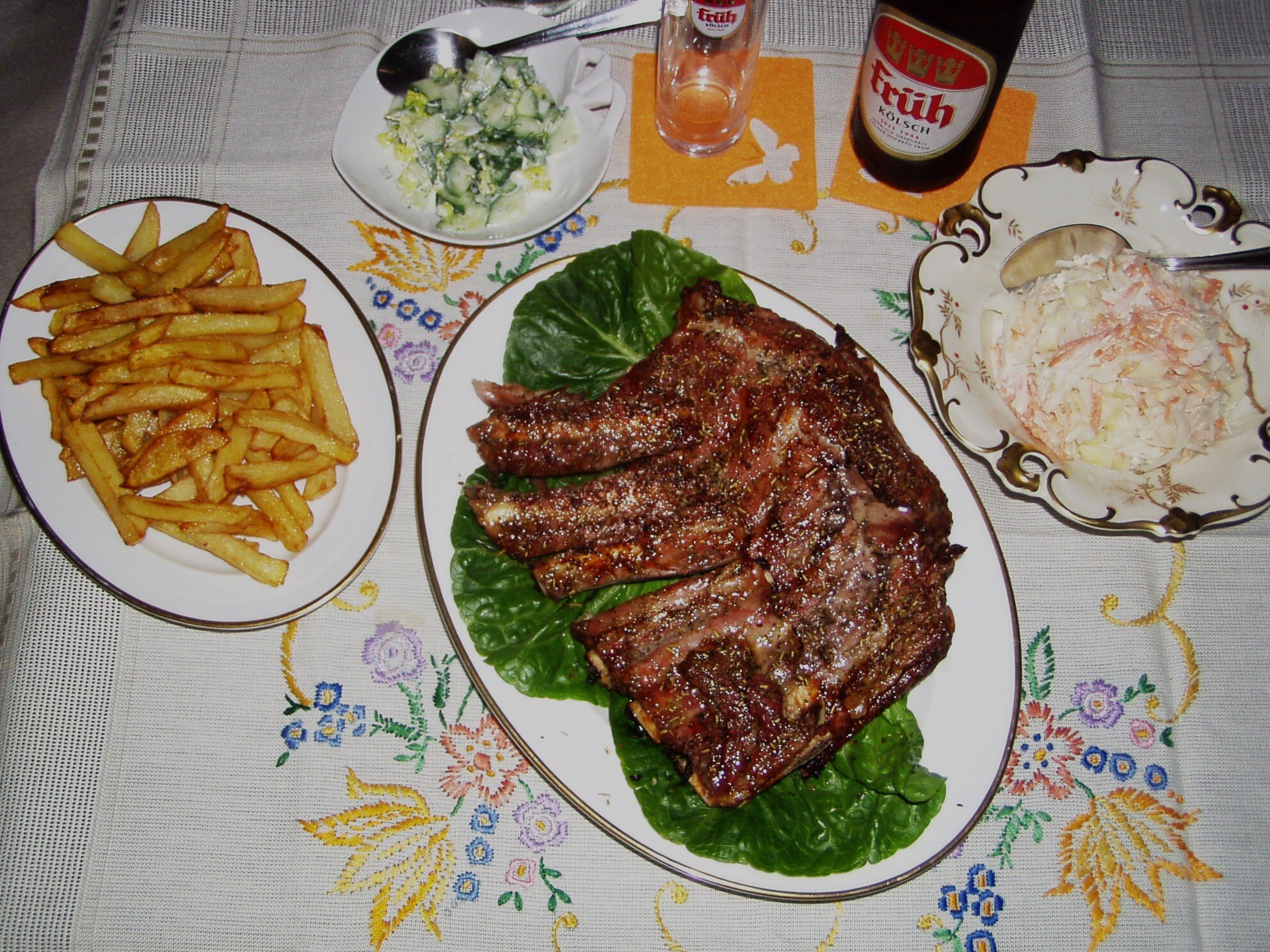 07.03.2024 um 07:09Schweinerippen. Dazu hausgemachte doppelt frittierte Pom-Frites und Sauerkrautsalat (+ Mayo, fein gehackter geschälter Apfel und geriebene Karotten)