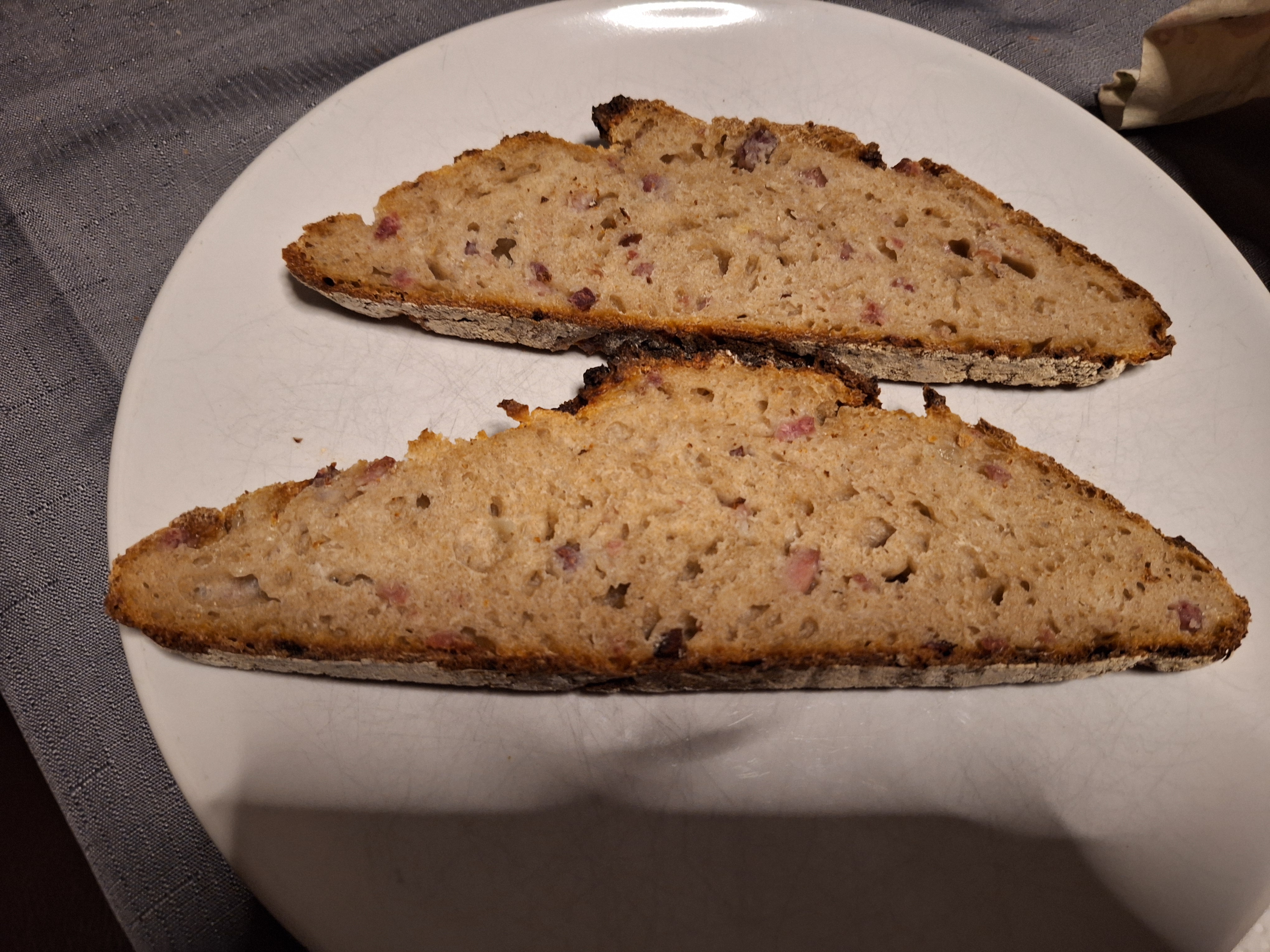 05.02.2026 um 17:54Eierschmier auf frisch gebackenem Sauerteig-Dinkel-Brot, diesmal mit Zwiebelwürfeln und Schinkenwürfeln 😋