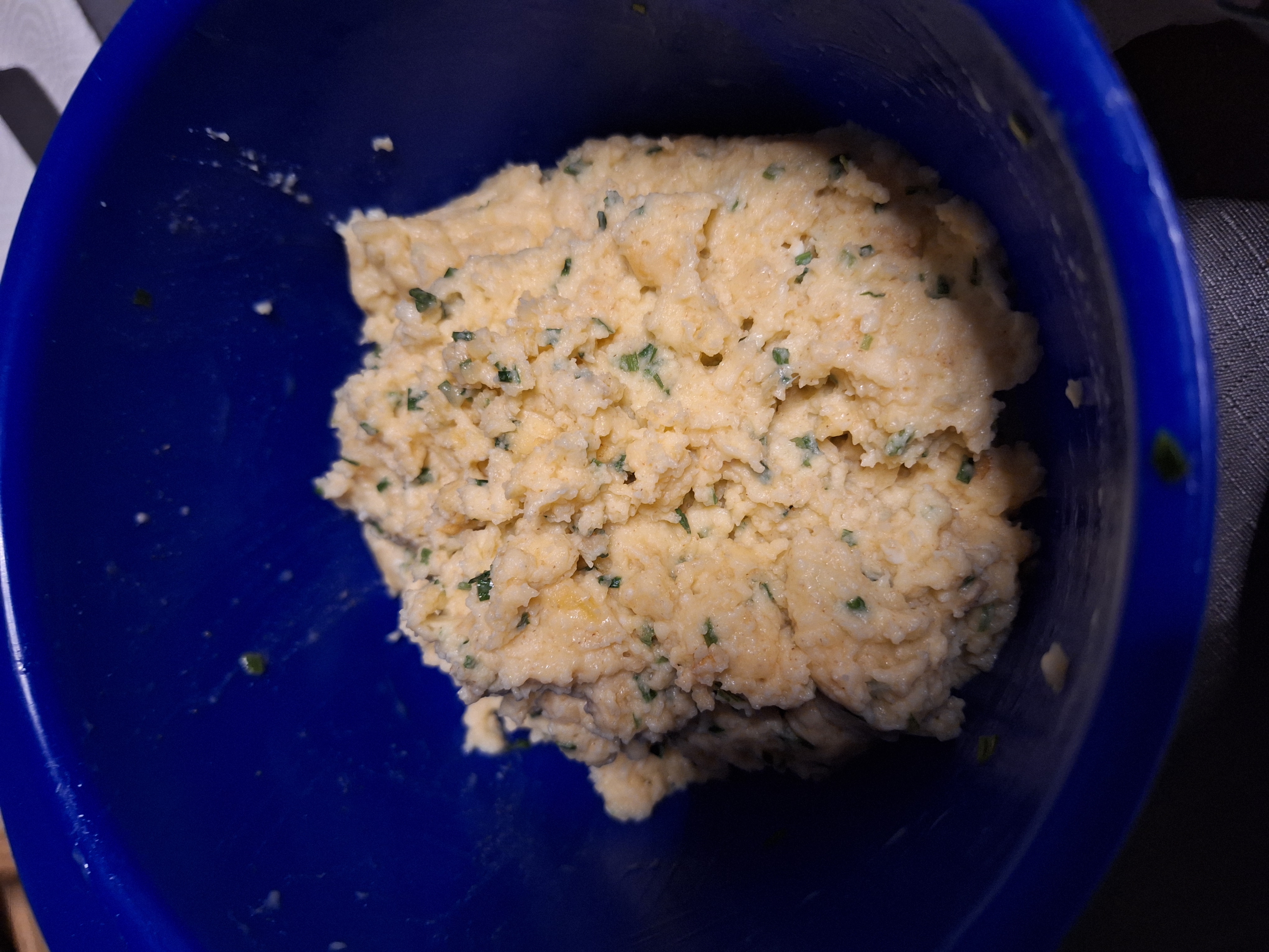 Ein bisschen wie Rührei, aber von festerer Struktur. Statt Wasser hat mein Mann Milch verwendet, und das Fleisch weggelassen.