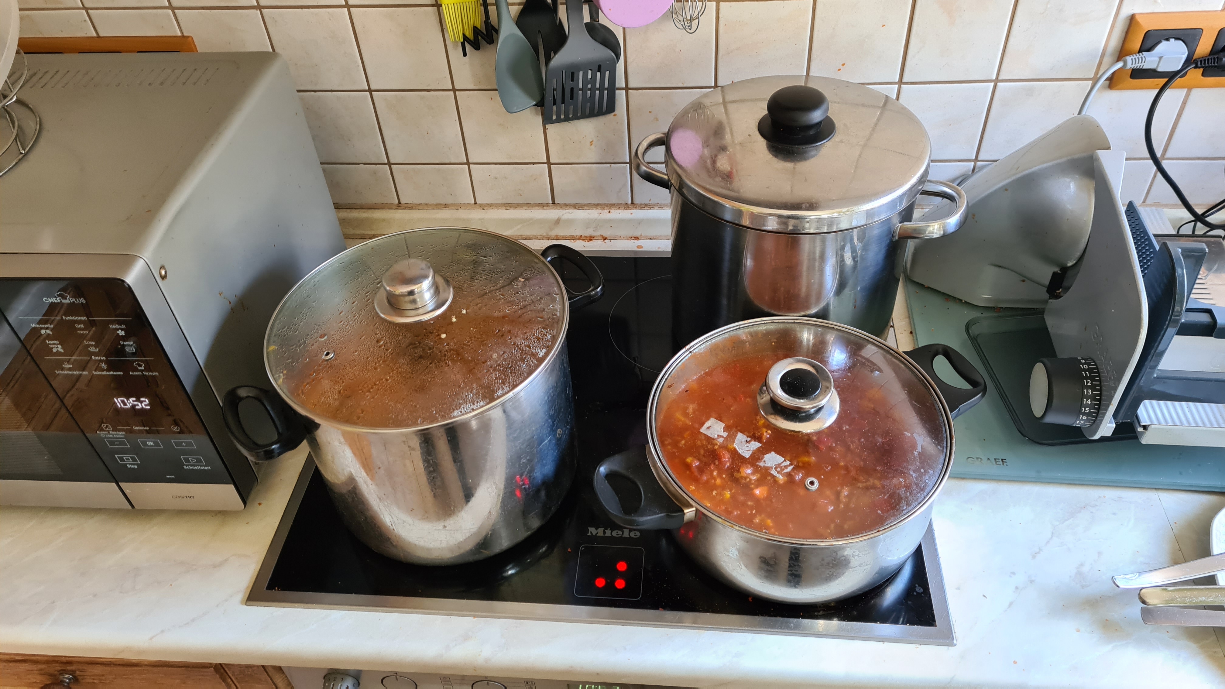 Viele Bohnen. Mein Mann ist der Ansicht, da könnten auch frische grüne Bohnen schmecken. Denkt dabei an Buschbohnen, zusätzlich zu den getrockneten. Neuerdings gibts in "meinem" Supermarkt auch schwarze Bohnen in Dosen. Noch nicht probiert.