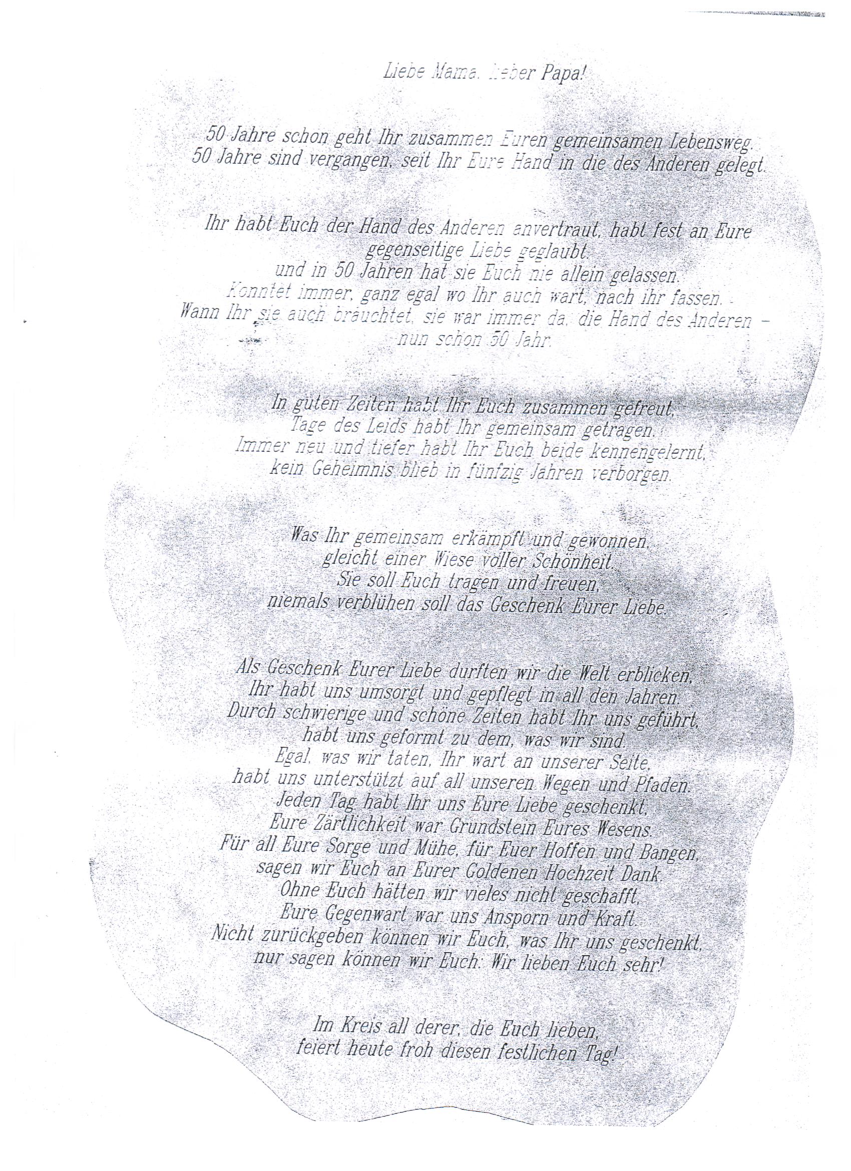 am 29.03 feiern meine Eltern ihre Goldene Hochzeit in einer Gaststätte mit ca. 115 Gästen, Musik und Tanz und hoffe sie haben noch eine schöne Zukunft. Vor ein paar Jahren haben sich meine Tante und Onkel bei ihrer GH zum Kasper machen müssen. Aus diesem Grund möchten meine Eltern auf Darbietungen zur Unterhaltung verzichten.